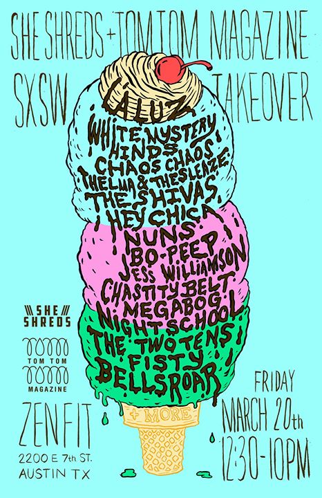 She Shreds MAGAZINE TAKES OVER SXSW 2015!! We’re partnering up with some of our favorite labels/booking agency/drum magazine/pedal company to bring you 40 bands from all over the world with, of course, some of the most amazing shredders ever.