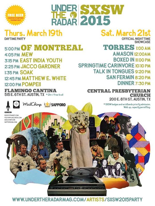 Under the Radar magazine  official nighttime showcase at Central Presbyterian Church on Saturday, March 21. Our events are set to feature performances from of Montreal, Mew, Torres, San Fermin, East India Youth, Matthew E. White, Jacco Gardner, Boxed In, SOAK, Amason, Springtime Carnivore, Pompeii, Talk in Tongues, and Dinner.